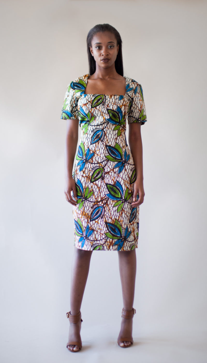 Tailored Body Conscious Dress Blue Disc On Orange “African Fabric” Ankara Dutch Wax Prints