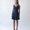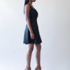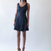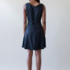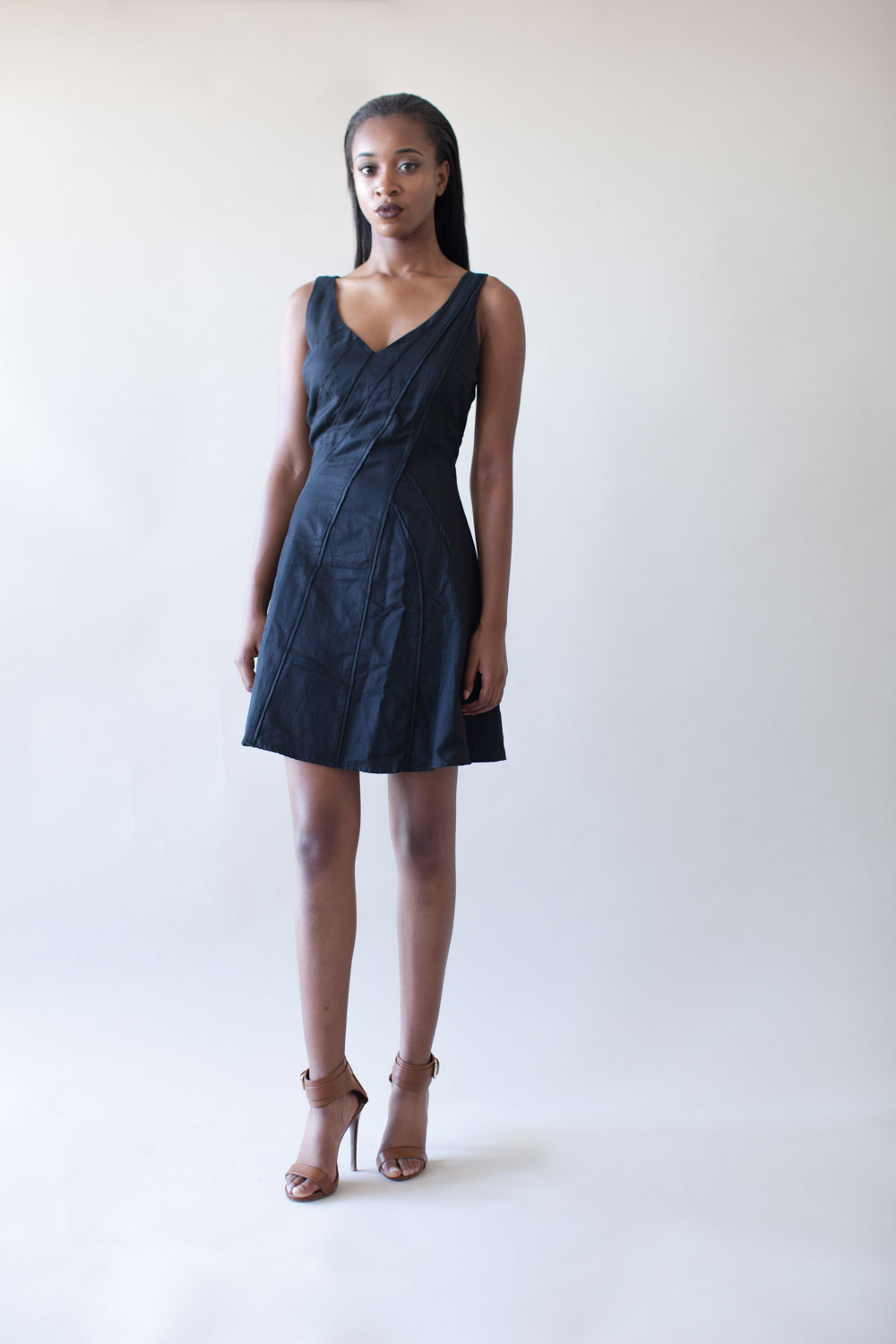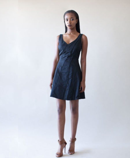 Be chic in this black a-line dress with a sweetheart neckline and wisps of piping across the front and back of dress.